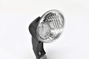 Halogén izzós, kedvező árú, normál dinamós első lámpa (6V, 2.4W).Beépített prizmával a nagyobb biztonság érdekében.A lámpa átmérője 80x60mm.Fényerősség: 10lux.A lámpa csak két vezetékes csatlakozóval rendelkezik!.